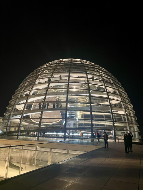 Abends begaben wir uns dann zu unserem Termin im Parlament. Nach der Sicherheitsinspektion wurden wir ins Reichstagsgebäude gelassen, wo wir auf der Besuchertribüne des Deutschen Budnestages der laufenden Plenarsitzung beiwohnen konnten. Diskutiert wurde an diesem Abend unter anderem über das „Sofortprogramm für die deutsche Wirtschaft“, eine geplante Modernisierung des Postrechts und einem Antrag der AfD zum dänischen Wohnungsbaumodell mit migrationsfeindlichem Kontext.
