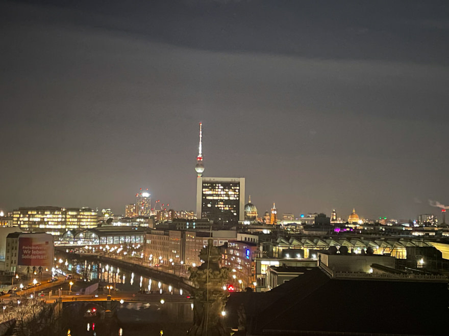 Nach ca. einer Stunde Sitzungszeit genossen wir noch die nächtliche Skyline Berlins aus der Kuppel des Reichstagsgebäudes, bevor wir uns nach einer Stärkung in Form eines originalen Berliner Döners zurück zum Hostel begaben.