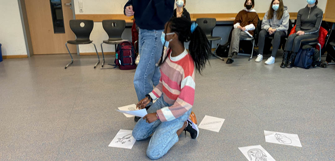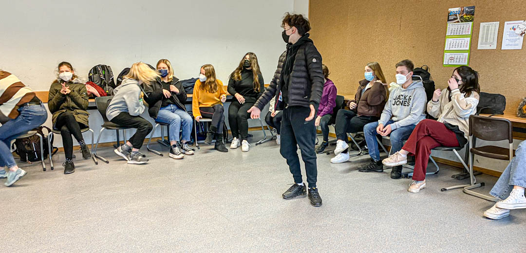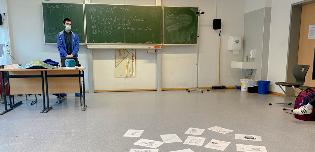 Ganz spielerisch funktionierte schnell die Vorstellung der Schülerinnen und Schüler. Bei den Schülern der Klasse 7 mussten dann in spannenden Duellen der Gruppen „Baguette“ gegen die Gruppe „Croissant“ französische Vokabeln erschlossen werden und zu Bildern zugeordnet werden. In französischen Liedern mussten die Wörter schließlich wieder erkannt werden. In der Jahrgangsstufe 8 ging es dann vor allem um französische Musik. Aus der Auswahl von mehreren Textpassagen mussten in einem französischen Lied eine kurze Passage erkannt werden, der passende Sänger dazu gefunden werden und schließlich sollte das frankophone Herkunftsland des Sängers oder der Sängerin erraten werden. Hier entwickelten die Schüler großen Ehrgeiz, immer schneller als alle anderen zu sein! Schließlich konnte Mathéo Chirat noch Fragen zu seinem Engagement und seinem Herkunftsland Frankreich beantworten. Begeistert verließen die Schüler der Klassen 7, 8, 9 und 10 nach diesen besonderen Französischstunden den Präsentationsraum.