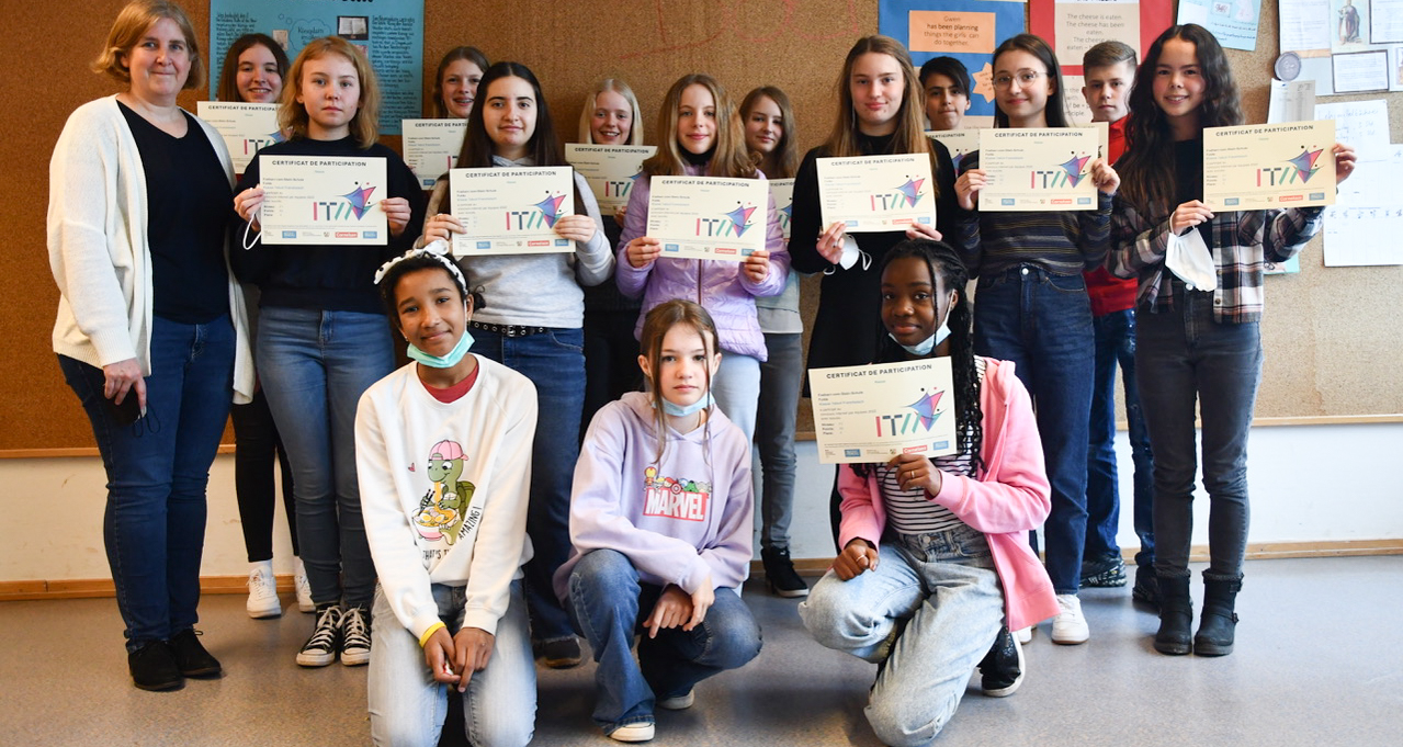 Es wird das Hör- und Leseverstehen gefordert, soziokulturelle Kenntnisse werden verlangt, Medienkompetenz und Internetrecherche sowie Teamarbeit sind wichtig, um in diesem Wettbewerb erfolgreich zu sein. In 10 Kategorien gibt es Fragen zu den Bereichen: Französisch, eine lebendige Sprache, Reisen und Begegnungen, die Welt der Bücher, es lebe der Sport, zu Tisch, auf Bildschirm und Leinwand, Musik à la françise, Umwelt und Wissenschaft, Engagement und Vielfalt und Wirtschaft und Arbeitswelt. Gemeinsam knobelten 2 Französischkurse im Januar an diesen Aufgaben und konnten sie erfolgreich bewältigen: der Kurs 8abc von Frau Habersack erreichte in Hessen den 1. Platz in der Kategorie 2./3. Lernjahr und konnte vom Cornelsen-Verlag und dem Institut Français Mainz kürzlich Urkunden und Buchpreise entgegennehmen. Einen beachtlichen 4. Platz schaffte der Kurs 7abcd von Frau Habersack in Hessen in der Kategorie 1. Lernjahr. Der Schulleiter Dr. Brüdigam gratulierte den Schülerinnen und Schülern sehr herzlich und betonte nochmals die Wichtigkeit der französischen Sprache in Europa.