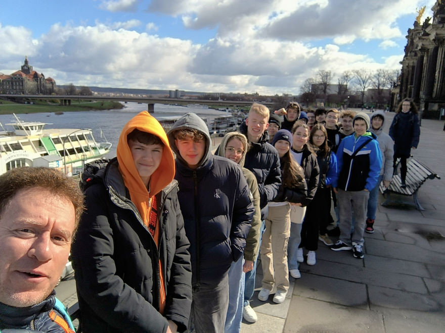 Ausgeschlafen und gestärkt ging es am Dienstagmorgen zuerst in die Dresdner-Altstadt, wo wir die rund 260 Stufen zur Aussichtsplattform der Frauenkirche erklommen mit einem herrlichen Blick auf Stadt und Elbe entlohnt wurden. Beim anschließenden Rundgang durch die Stadt wussten Herr Luck und Frau Nolte viel Nützliches und Interessantes zu berichten. Da es sich bei unserem Ausflug um eine Schulveranstaltung handelte, gab es nach jedem Input natürlich eine „Prüfung“, bei der es jedoch statt guter Noten Gummibärchen zu ergattern galt.