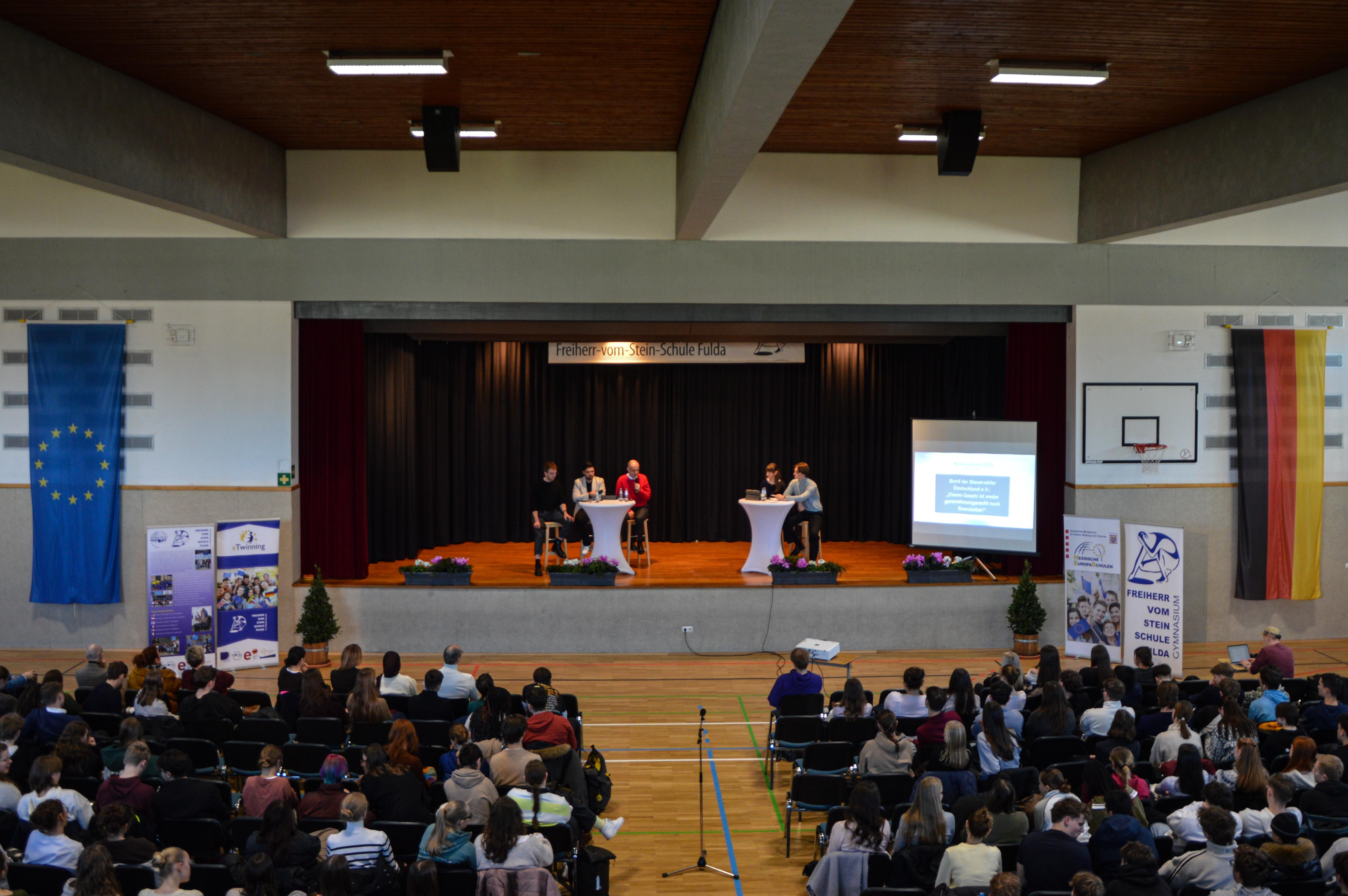 Am 22. Januar 2026 versammelten sich die Schülerinnen und Schüler der Sekundarstufe II der Freiherr-vom-Stein-Schule in der Aula ihres Gymnasiums, um sich gemeinsam eine Podiumsdiskussion anzusehen sowie im Anschluss selbst Teil dieser zu werden.