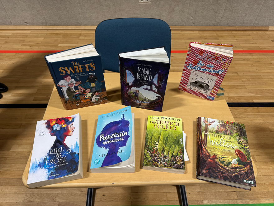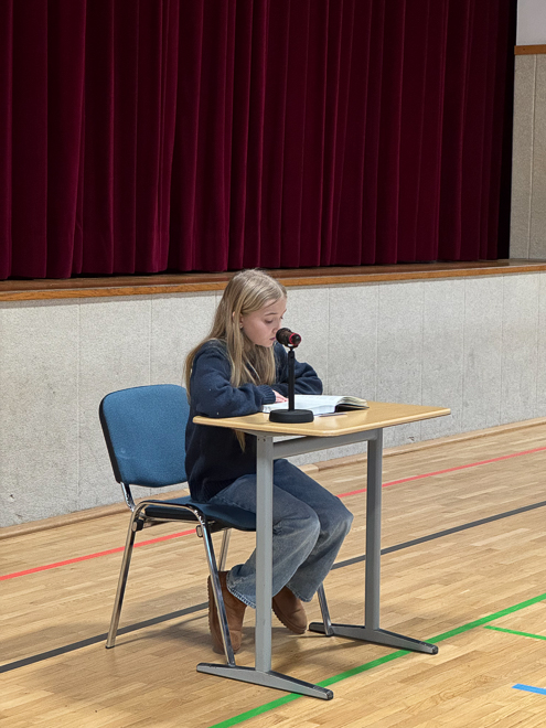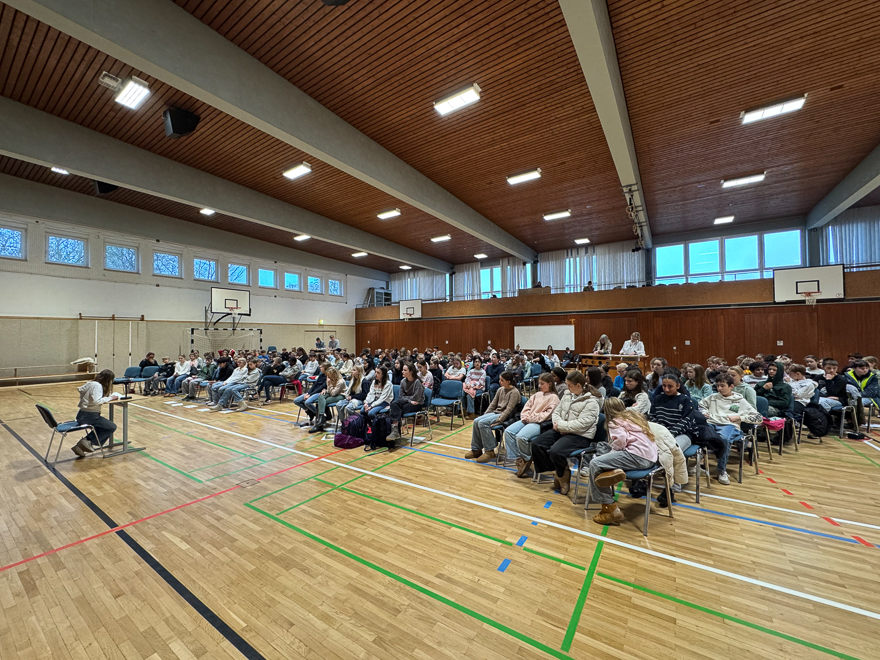 „Die Schrift hat es im Jahr 2025 schwer“, so schrieb Jakob Schrenk am 29. Mai 2025 in seinem Artikel „Hört doch mal auf zu labern!“ im Süddeutsche Zeitung Magazin. Die Lesekompetenz von Grundschülern wie von Erwachsenen gehe zurück und die Zahl der Menschen, die Bücher kaufen, schrumpfe seit mehr als zehn Jahren. Glücklicherweise war am Freitagmorgen von dieser eher düstereren Bestandaufnahme in unserer Turnhallenaula wenig zu merken. In den vergangenen Wochen hatten sich alle Schülerinnen und Schüler der sechsten Klassen auf den Schulentscheid des Vorlesewettbewerbs vorbereitet. Dort galt es, Zuhörende wie die Experten unserer Jury von den eigenen Lesefähigkeiten zu überzeugen. Und dazu gehört nicht nur fehlerfreies Lesen, den Schülerinnen und Schülern musste es auch gelingen, die vorgelesenen Geschichten zum Leben zu erwecken. Dass das allen sechs Teilnehmerinnen mehr als ausgezeichnet gelang, zeigte sich vor allem an der für die Turnhallenaula sonst ungewöhnlichen Ruhe. Auch wenn einige Schülerinnen und Schüler zu Beginn noch erklärt hatten, dass den Sportunterricht noch lieber mochten als zu lesen, folgten die fast 180 Zuhörerinnen und Zuhörer den Abenteuern von den Swifts, den Teppichvölkern oder dem Mädchen namens Willow mit andächtiger Gebanntheit und großer Begeisterung. Besonders spannend wurde es, als die sechs Finalistinnen aus dem Fremdtext „Magic Island – Ruf der Seelentiere“ vorlasen, den wie immer Frau Belz-Böhm von der Buchhandlung Paul und Paulinchen ausgewählt hatte, die Frau Reith, Frau Weßler und Herrn Lorenz in der Jury unterstütze. Diese hatte es bei der anschließenden Beratung schwer, denn die sechs Schülerinnen, die hier angetreten waren, sind alle tolle Leserinnen. Auch wenn Schrenk und vielen Studien anderes attestieren – schwindende Lesekompetenz war bei unseren Finalistinnen nicht zu erkennen. Und so gab es am Ende auch nicht sechs Plätze, sondern Marie Pommée, Lilith Mews, Hannah Kreß, Mia Hartmann und Emilia Eisfeld können nicht nur mit einem tollen Buchpreis nach Hause gehen, sondern auch mit der Gewissheit, dass sie fast genau so talentierte Leserinnen wie unsere Schulsiegerin Mia Hergert sind. Der drücken wir nun alle gemeinsam die Daumen, dass sie das Publikum auch bei den nächsten Wettbewerbsstufen so mit ihrer Leseleistung verzaubert wie uns alle beim Schulentscheid in der Aula.