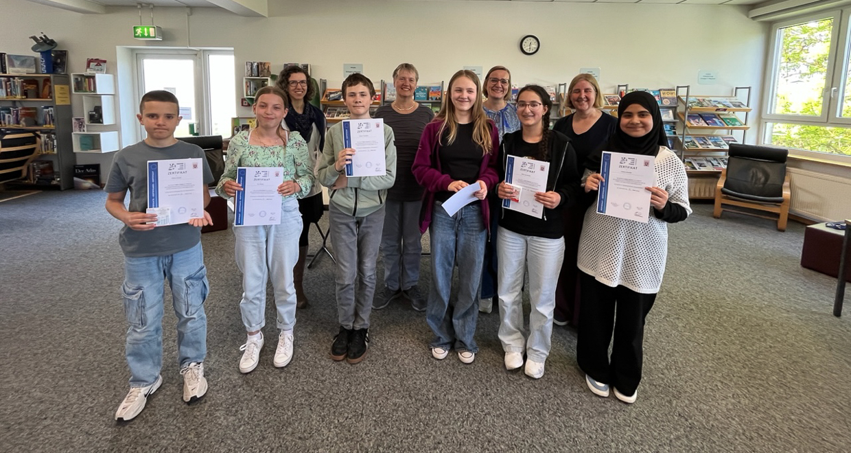 Diese sind in Spanisch Emma Erös und Hana Sadikovic (7. Klasse - 1. Platz), in Englisch Rahaf Rammo (6a – 1. Platz) und Altea Laske (6b – 2. Platz), in Latein Simon Trautwein (7e – 1. Platz) sowie in Französisch Halima Wardak (7. Klasse - 1. Platz). Herzlichen Glückwunsch an die Preisträgerinnen und Preisträger, aber auch an alle anderen Teilnehmerinnen und Teilnehmer, die ihre Aufgabe souverän gemeistert haben und den Mut bewiesen haben, (unbekannte) Texte in der Fremdsprache vor Publikum vorzutragen. Eine wirklich tolle Leistung und ein rundum gelungener Lese-Vormittag, der Lust auf Lesen und Fremdsprachen-Lernen macht!