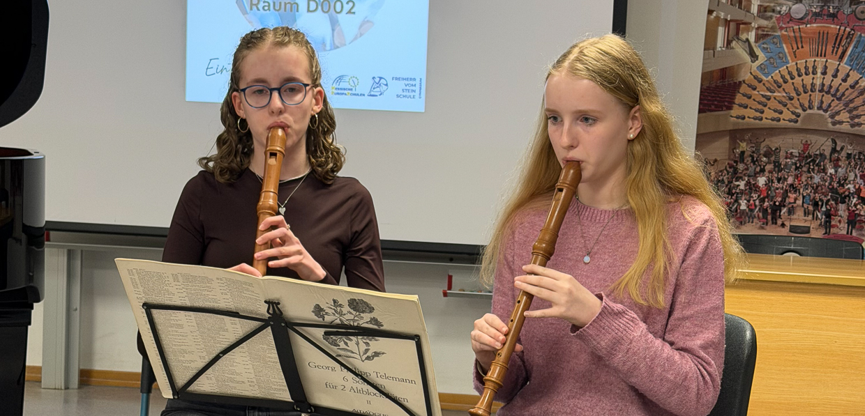 In einem stilistisch vielseitigen und anspruchsvollen Konzert glänzte zu Beginn Sam Spindler, Klasse 6, mit dem bekannten und eindrucksvollen Klavierstück „Gewitter“, Opus 109, Nr.13 von Burgmüller, welches das Wetterphänomen hörbar werden ließ. Greta Böhm, Rieke Burgwal, Mia Hergert und Emily Kormann aus der Bläserklasse 6, die erst seit ca. 1,5 Jahren Instrumentalunterricht auf der Querflöte erhalten, präsentierten das zweistimmig und sauber intonierte Stück „Donna, Donna“, das sich in harmonisch Moll an der Tradition jiddischer Musik orientiert, seine Bekanntheit jedoch erst in den 1960er Jahren durch Joan Baez erlangte. Franziska Weber aus Klasse 7 beeindruckte mit ihrem Beitrag an der Altblockflöte mit der „Gigue“ aus Johann Sebastian Bachs „Partita 3“, die im Original für Violine komponiert wurde. Ein besonderes Highlight des Abends war der Beitrag des erst elfjährigen Onrie-Ilaj Bajrovik aus Klasse 5, der seine erstaunliche Fingerfertigkeit und Ausdruckskraft mit den Stücken „Mazurka Glissando“ von Ernesto Lecuona, dem „kubanischen Gershwin“, und „O Polichinello“ von H. Villa-Lobos präsentierte und mit kräftigem Applaus belohnt wurde. Johanna und Franziska Weber, beide Klasse 9, trugen im Anschluss die beiden Sätze „Soave“ und „spirituoso“ aus Georg Friedrich Telemanns Sonate Nr. 6 für Altblockflöten vor und zeigten einmal mehr, wieviel Rhythmus und Schwung in der Musik des 18. Jahrhunderts steckt. Einen besonderen Moment schenkte Kerem Kaya den Zuhörern mit seinem Vortrag auf der Konzertgitarre. Neben einem beschwingten türkischen Volkslied beeindruckte er mit seiner Spielfreude und Fingerfertigkeit in einer eigenen Version des bekannten „Hit the Road, Jack“ von Ray Charles. Jack Dirksen, Klasse 9, brachte den Flügel in all seinen Facetten mit dem technisch mit vollgriffigen Akkorden wie musikalisch anspruchsvollen „Prelude in cis-Moll“, Opus 3, Nr. 2 von Sergej Rachmaninow zum Klingen. Die drei Schwestern Johanna, Mathilda und Franziska Weber wagten sich im Anschluss an die beiden Sätze „Lentement“ und „Soave“ aus Johann Matthesons Triosonate Nr. 1 und überzeugten mit Präzision und Tonkontrolle. Ruben Alva Pramme, Jahrgangsstufe 13, wagte sich mit seinem Solobeitrag auf der Oboe an die beiden Sätze „Allegro“ und „Andante moderato“ des anspruchsvollen Stücks „Musik für Oboe allein“ von Erich Sehlbach an Musik aus dem 20. Jahrhundert, das er wunderbar meisterte. Den Abschluss eines gelungenen Konzertabends gestaltete Matteo Lotz, Jahrgangsstufe 12, mit „Defying Gravity“ aus dem Musical „Wicked“, in dem er die Zuhörenden in eine klangliche Welt voller Magie und Emotion entführte. Durch das Programm führte Musiklehrerin Corina Müller-Mohr mit unterhaltsamen und interessanten Hintergrundinformationen. Dass sich das Üben gelohnt hat, davon konnten sich die Zuhörerinnen und Zuhörer selbst überzeugen und bedankten sich mit einem herzlichen Applaus bei den jungen Musici für einen gelungenen Abend.  Herr Dr. Brüdigam bedankte sich bei allen Musizierenden sowie den Eltern und Unterstützern der jungen Talente, die mit viel Spielfreude und Ausdruck ihr Können zeigten.