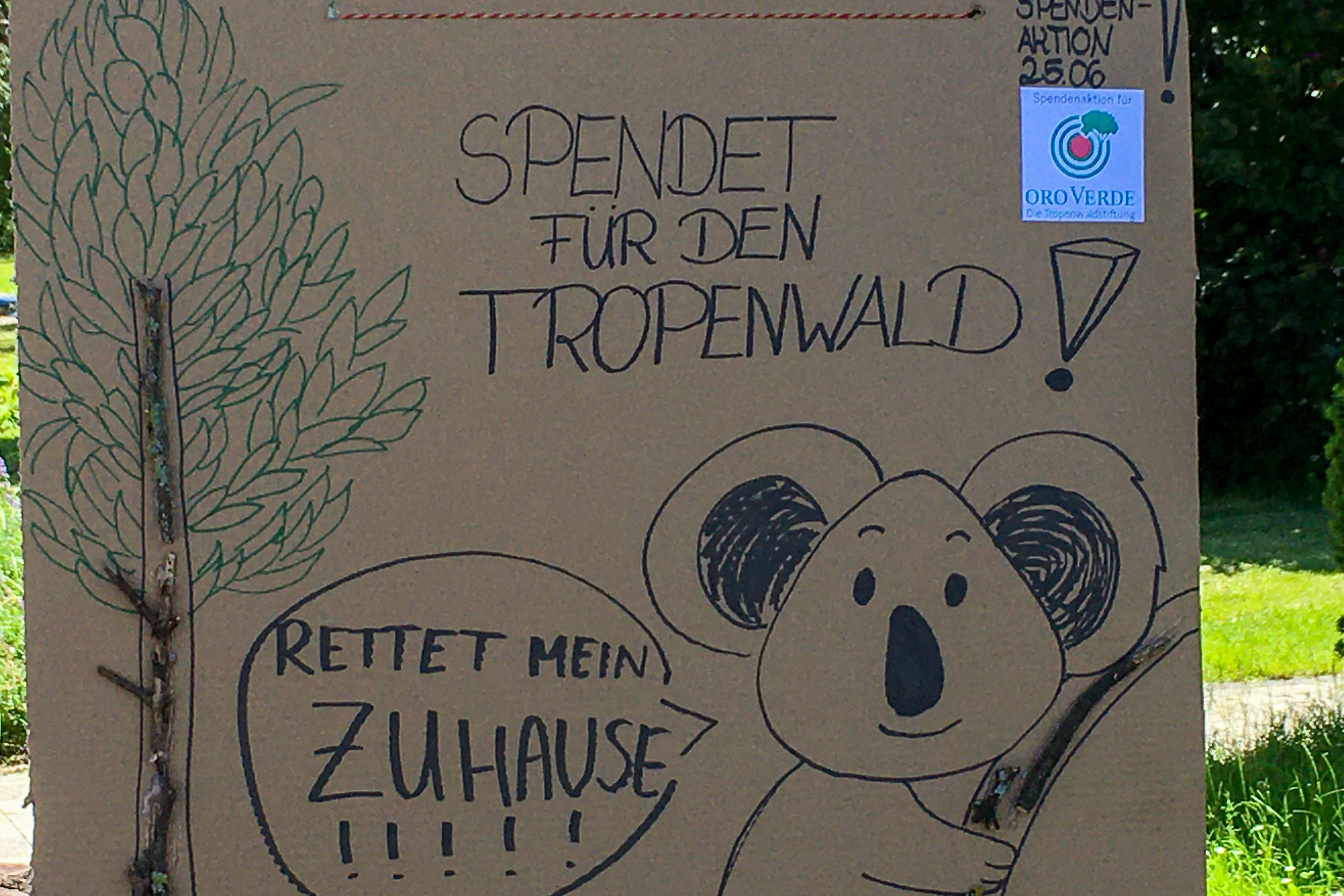 Die Schülerinnen und Schüler beschäftigten sich im Rahmen des Unterrichts mit dem Thema Umweltschutz und Nachhaltigkeit und gestalteten anschließend unter dem Motto: „Wenn Bäume sprechen könnten…“ Plakate, die auf die desolate Situation der Bäume und Wälder hinweisen sollten. Mitarbeiter der Tropenwaldstiftung OroVerde haben sich unmittelbar nach Eingehen der Spende mit der Schule in Verbindung gesetzt und sich herzlich bedankt. Mit dem Geld habe man eine zweitägige Regenwaldpatrouille unterstützt, die bestimmte Gebiete vor illegaler Brandschatzung oder Brandrodung bewacht.