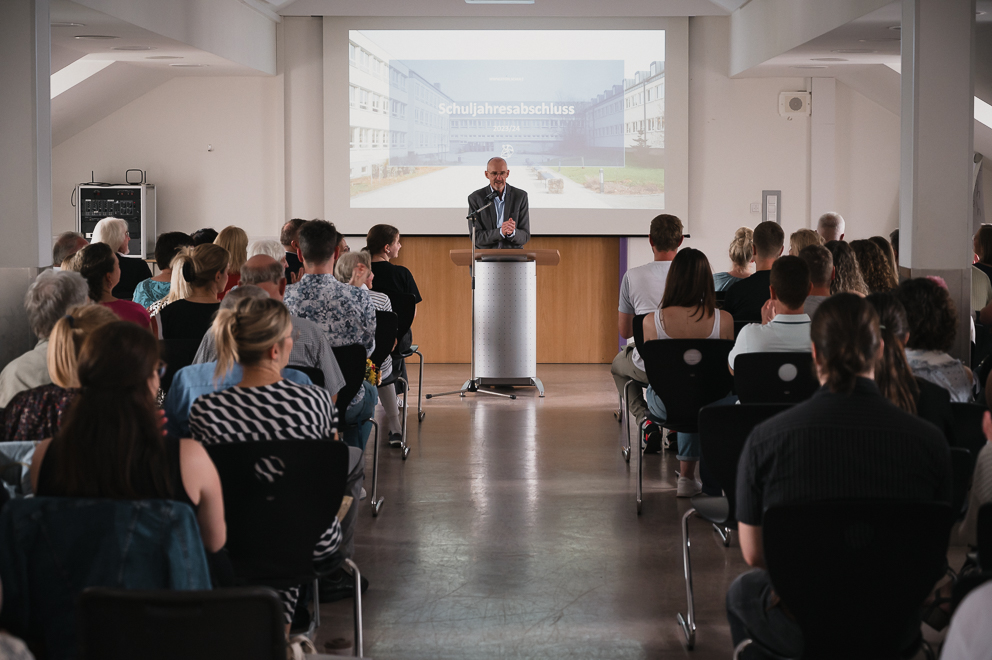 Auch für die Verabschiedung von Müller hatten sich die Fachschaften Musik und Religion sowie der Personalrat und die Schülerschaft etwas Besonderes einfallen lassen. Neben musikalischen Beiträgen kamen die Vorsitzende des Personalrates Karin Fischer, die Schülersprecherin Nele Vogel sowie die Leiterin des Schul- und Sportamts Petra Korges-Vieres zu Wort, um Müllers Engagement und seine Verdienste zu würdigen.